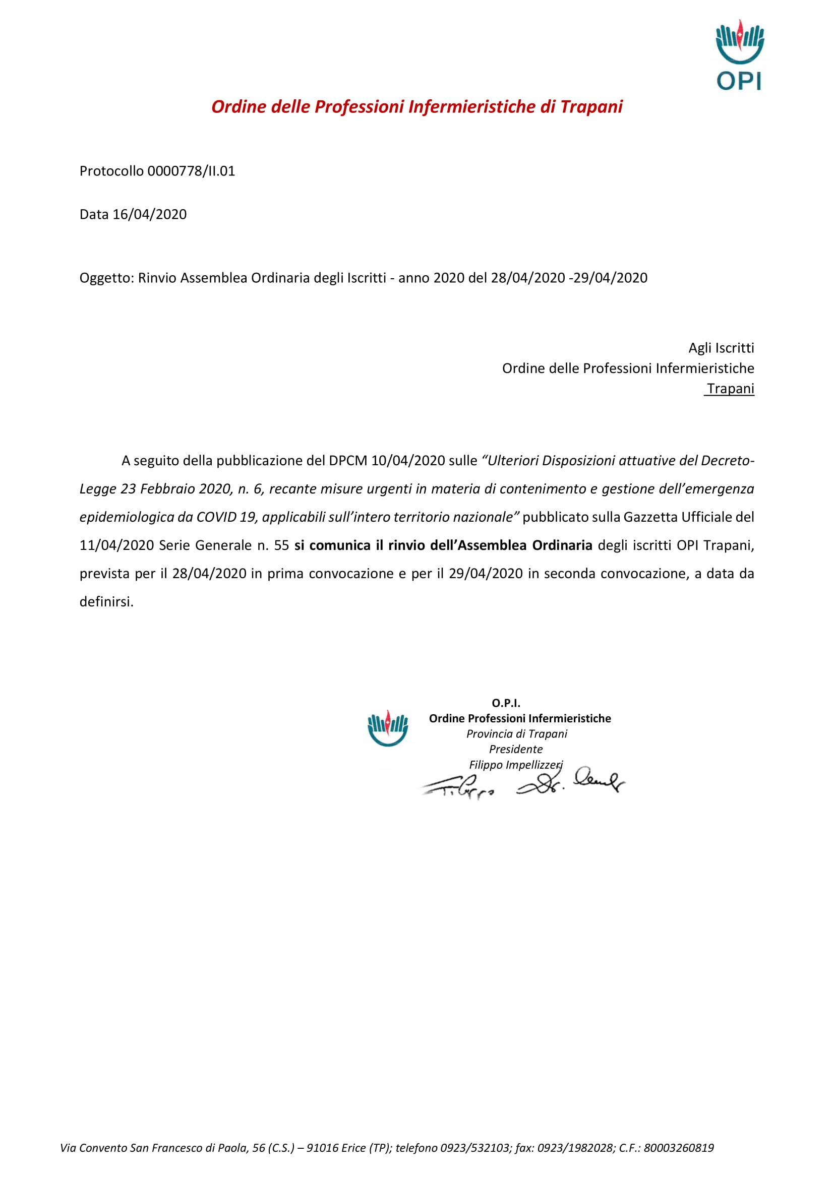 Rinvio Assemblea Ordinaria degli Iscritti – anno 2020 del 28.04.2020 -29.04.2020