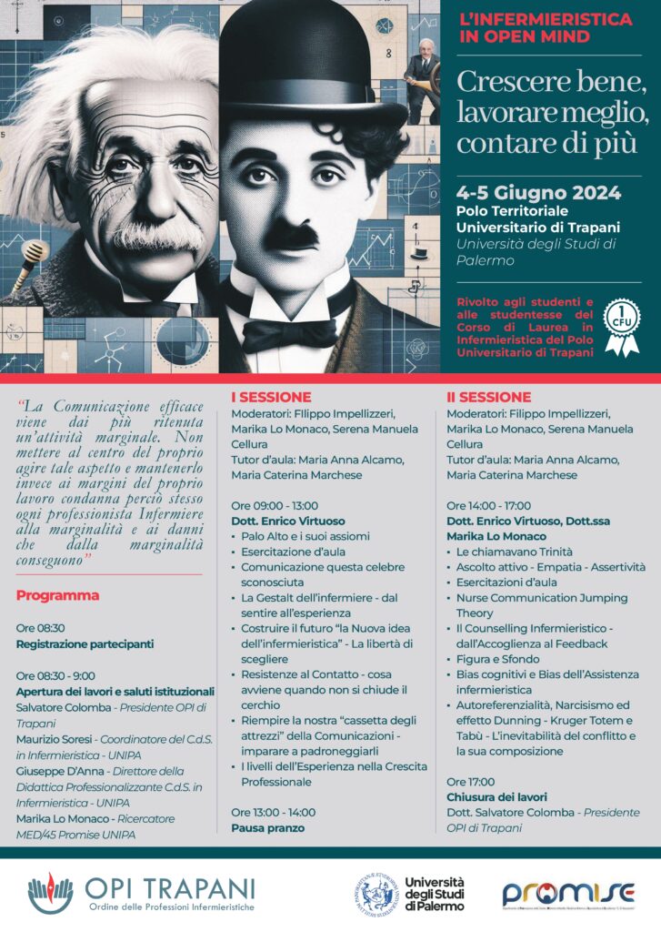 L’Ordine delle professioni Infermieristiche di Trapani, organizza un Evento Formativo dal titolo ” L’Infermieristica in Open Mind crescere bene, lavorare meglio e contare di più” il 04 – 05 Giugno 2024 presso l’Aula Magna del Polo Territoriale Universitario di Trapani rivolto agli studenti e alle studentesse del Corso di Laurea in Infermieristica del Polo Universitario di Trapani