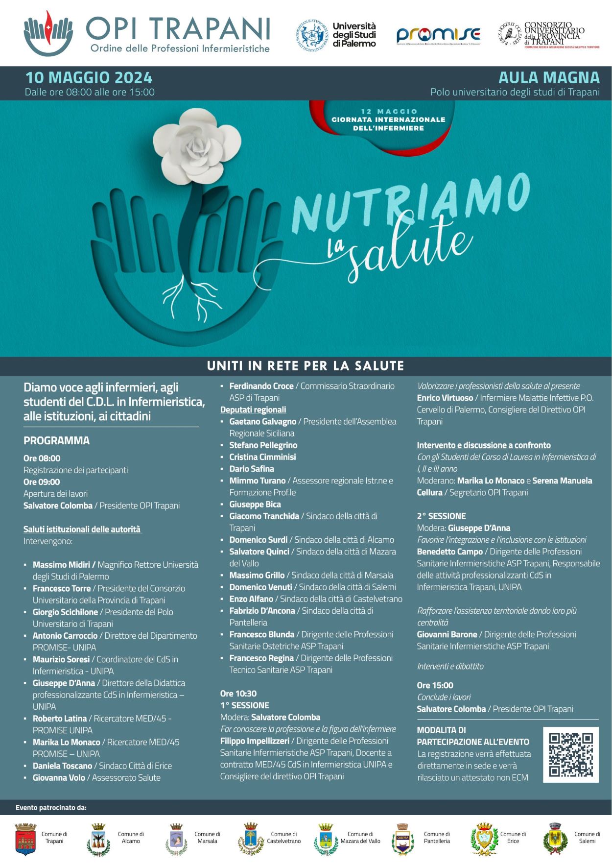 L’Ordine degli Infermieri di Trapani, in occasione della Giornata Internazionale dell’Infermiere, in data 10 Maggio 2024, organizza un Evento dal Titolo ” Uniti in rete per la salute – diamo voce agli Infermieri, agli studenti,alle istituzioni e ai cittadini” che si terrà presso l’Aula Magna dell’Università degli Studi Polo Territoriale di Trapani. Verrà rilasciato Attestato di Partecipazione – NO ECM