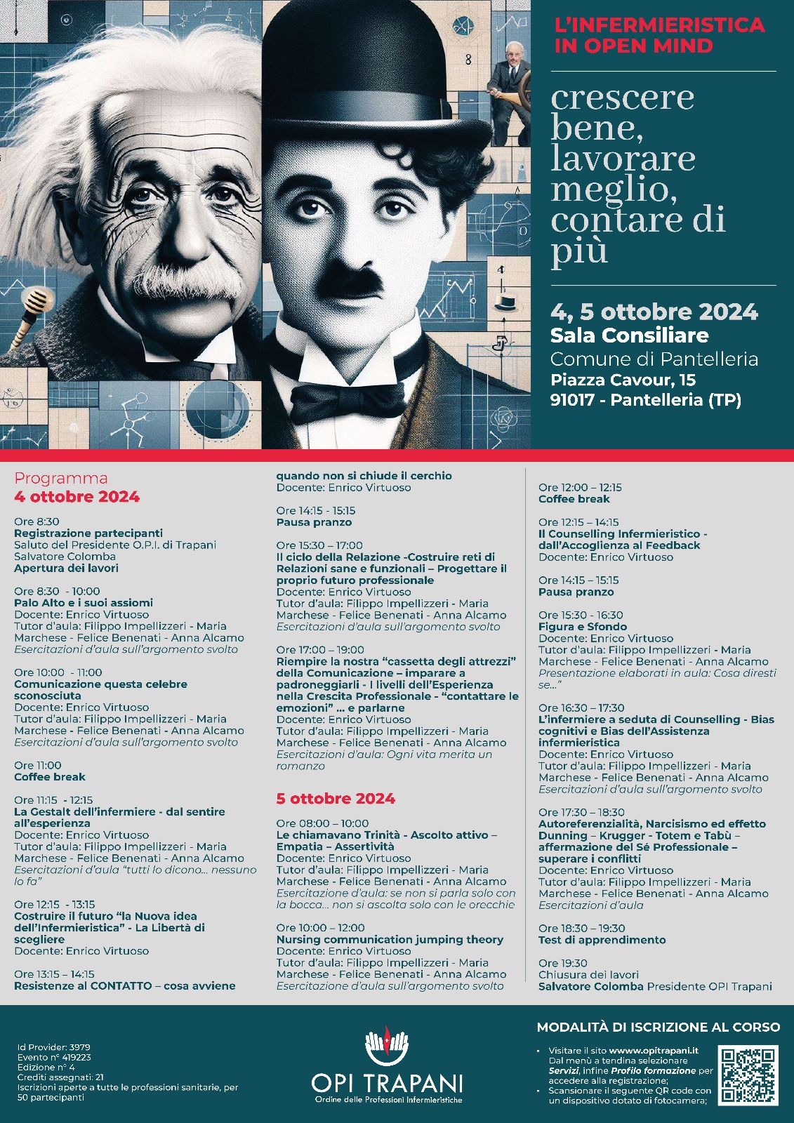 L’Ordine delle professioni Infermieristiche di Trapani, organizza un Evento Formativo dal titolo ” L’Infermieristica in Open Mind crescere bene, lavorare meglio e contare di più” il 04 e 05 Ottobre 2024 presso la Sala Consiliare di Pantelleria.